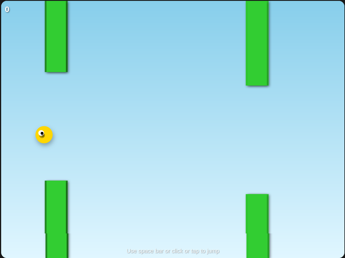 How to play: You can jump using space bar or click on the game. The goal is simple. Just avoid incoming pipes with your yellow ball.
